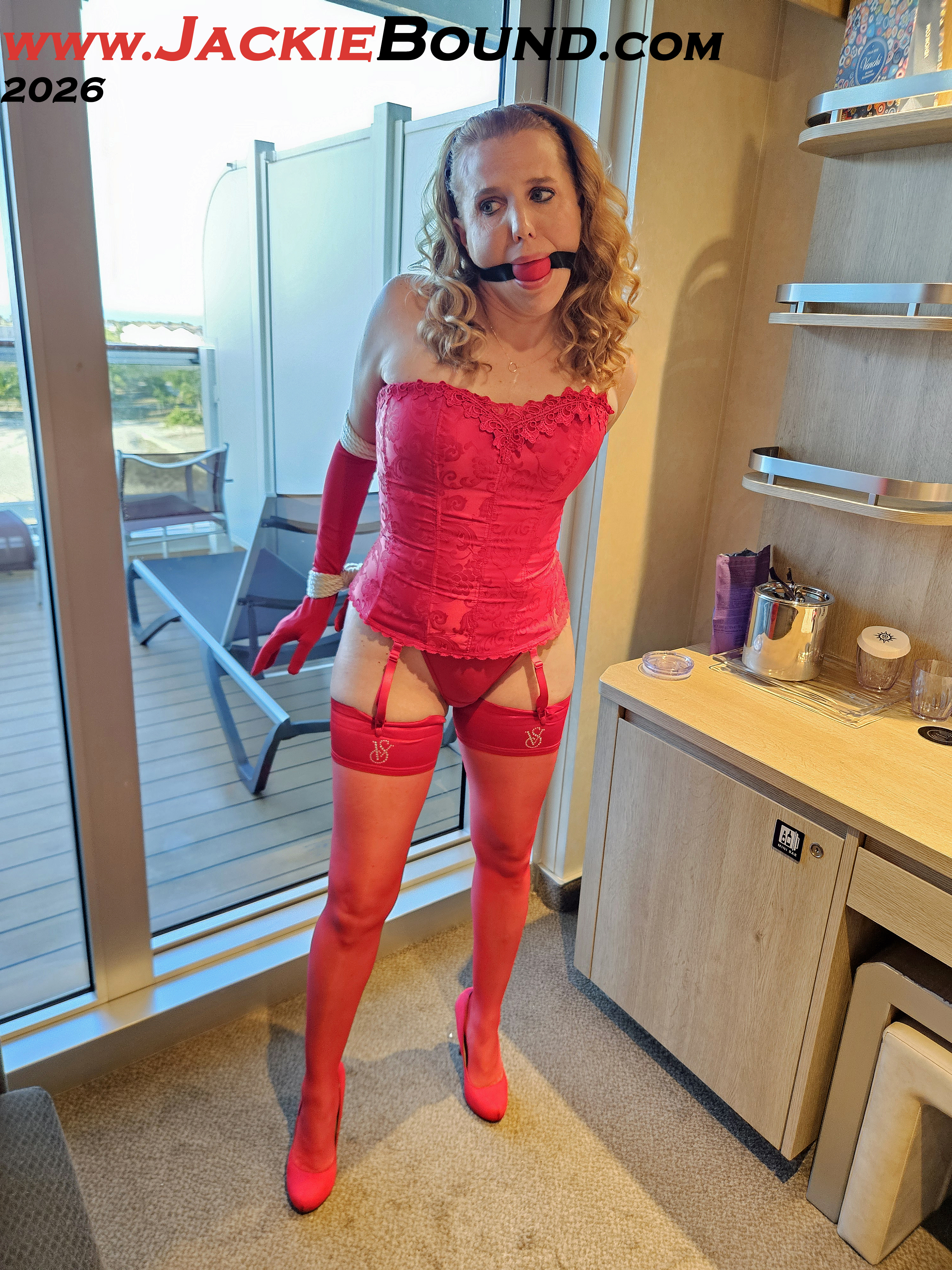 Believe it or not, on this shoot, it was difficult to get the right background. We were on a 4 day cruise and could not coordinate blue skies and water in the background. When we finally stopped at the private island, we were committed. Anyway, I'm all red this Valentine's Day! From the red brocade sweetheart neckline corset, to the garters, stockings, panties, gloves and ball gag. Johnny had to use some rope to tie my wrists above my head to keep his luscious red valentines treat from getting away. Not that he ever had to worry about that since I am his forever Valentine! ;)