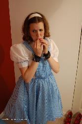 I love my costumes and St Patrick's Day is always a fun time for me to dress up. In 2011, I decide to be a Leprechaun. So, I put on my cute little Leprechaun dress, thigh high tights, Leprechaun hat and sparkly green bowtie. And, if I'm wearing a costume, it's a given that I am going to get tied up. Johnny decides to go with a quick chair tie with sports cuffs tying my hands to the chair and leather straps on my legs. He then puts a microfoam tape gag on my mouth and lets me wriggle around in my chair. This leprechaun isn't going to make it to the pot of gold!