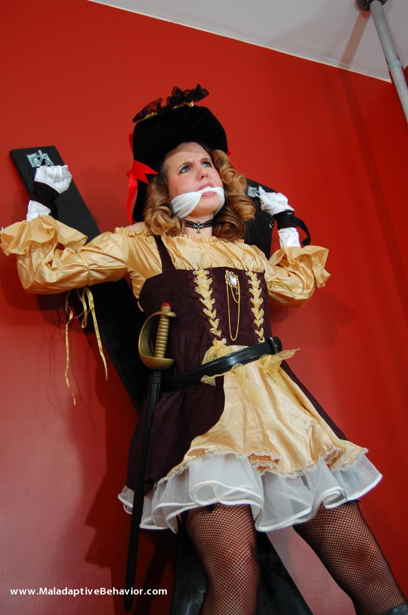 Just when I think I am safe and relaxed I am tied to a giant St. Andrews cross in my not so period worthy pirate costume. I've never had to walk the plank before, but can't exactly protest through the cloth that is covering my mouth (if that is indeed the plan), Matey! All I can do is glare and shake in anticipation, of what might come next. And hope they think I am charming enough to keep on board. ;)